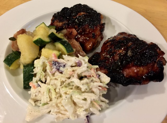 Tonight’s grilled chicken thighs are the best that John has ever made. They are juicy and cooked through and have a great BBQ sauce char. Yum! I cannot even begin to describe how great these are.