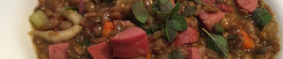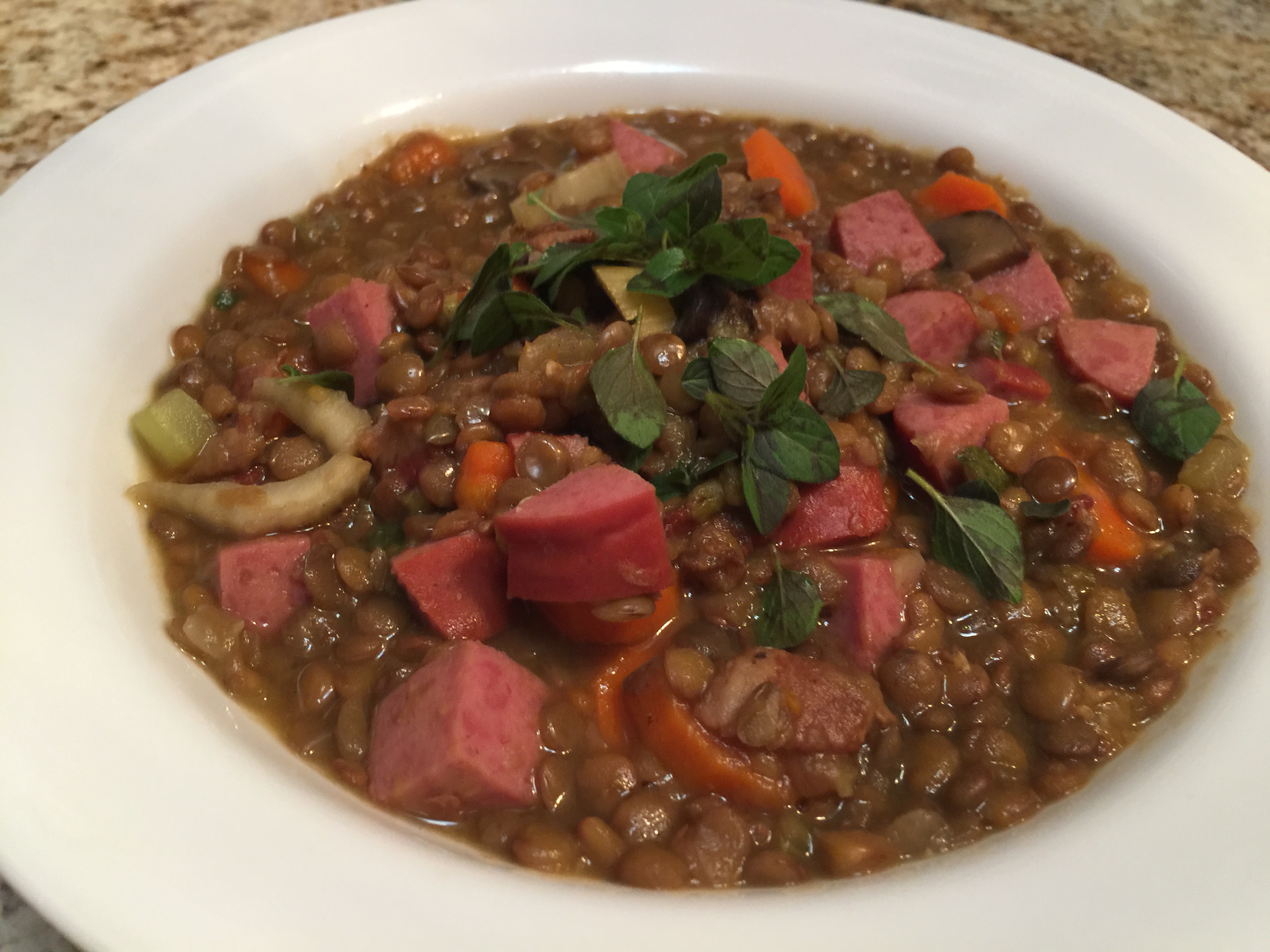 Today’s dinner is really more of a cool weather dish. Lentils are a quick cooking legume and have a delicious earthy flavor. We add turkey sausage, carrots, onions, celery, and a lone mushroom into our stew. I top mine with some fresh oregano from the garden. It turns out very tasty. It helps that we have not prepared this in a long time so the taste is unexpected.