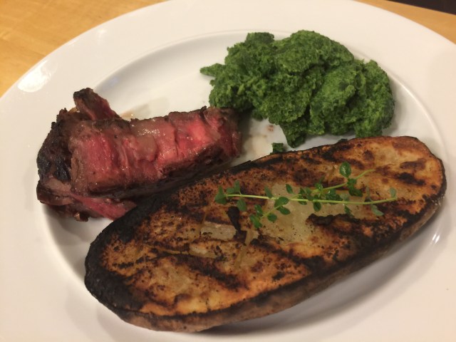 You could grill it full time on the grill but since we are the House of Gizmos we use the immersion circulator to cook the steak to 125F and then slap it on the grill for 2 minutes on each side. The baked potato halves which have been cooked in the microwave get the grill treatment as well. A little embarrassing since I am the queen of vegetables is to admit that the spinach is Stouffer’s spinach soufflé and also cooks in the microwave.