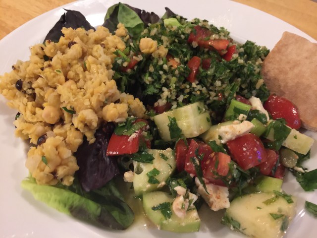 Today John is at the office working so dinner is in my hands. No surprise that it is meatless! Dinner tonight consists of Lebanese tabbouleh and chickpeas with olive oil and cracked juniper berries on mixed greens plus a tomato and cucumber salad. I added some feta to my salad but if you omit the feta, the dinner is totally vegan. This is a no-cook dinner perfect for a hot (and smoky) summer night.