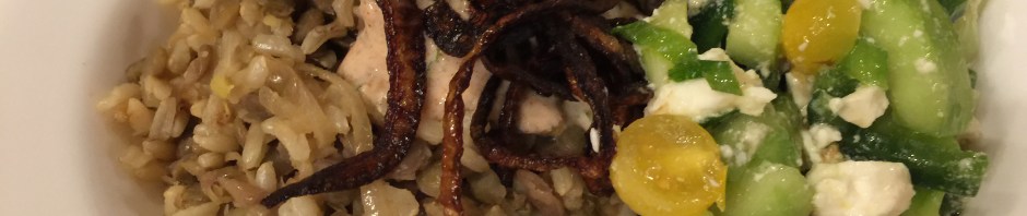 Mujaddara is a Middle Eastern dish. It is reputed to be the pottage that Esau used to buy Jacob’s birthright in the Bible. (Wikipedia) It seems a humble dish. Our mujaddara is a combination of plain brown lentils and brown rice with caramelized onions and a topping of spiced yogurt and crispy onions. As you can see my crispy onions are a little too crispy but since the spiced yogurt is full of “warm” spices, I like the accidental burnt flavor.