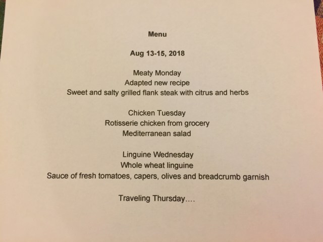 This is a short menu this week because on Thursday I am out of here and will not be cooking until September! Luckily, though, I will still be eating and if I have time and the wifi gods are smiling I will post some of the things I have eaten. I have been very strict with my healthy diet lately (except for the fried scallops) and I am looking forward to some culinary indulgences.