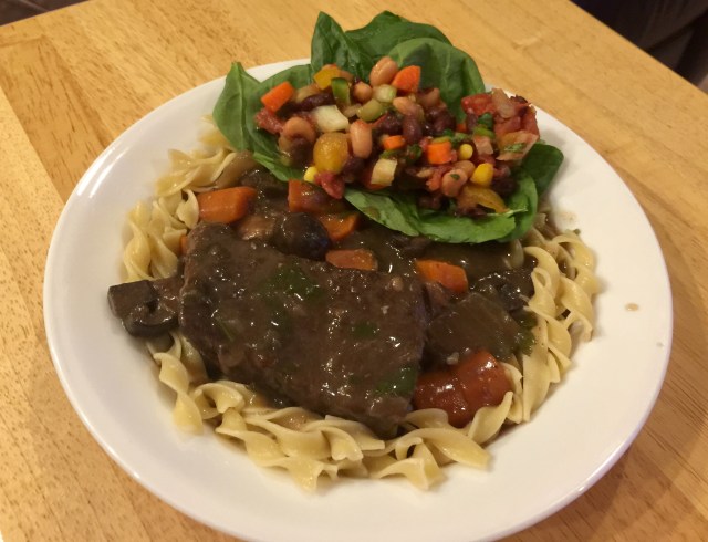Tonight is supposed to be rotisserie chicken from the grocery store but we have leftover short ribs and I am not about to throw out tasty food. I think a lot of people give leftovers a bad name. Especially when the food has been braised the taste quality improves over time. Plus John suggests we have noodles with our leftover beef and he never suggests noodles because he does not like the way they slip off your fork. So I am not about to turn his offer down.