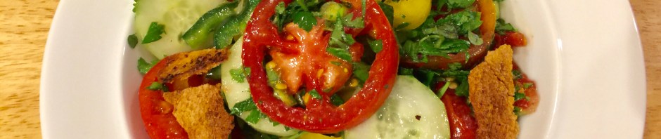 After settling down with a glass of wine and some pretzels to talk about our days’ events, I make an herb and tomato salad which includes two types of peppers, scallions, and a toasted pita. It is really a fattoush.