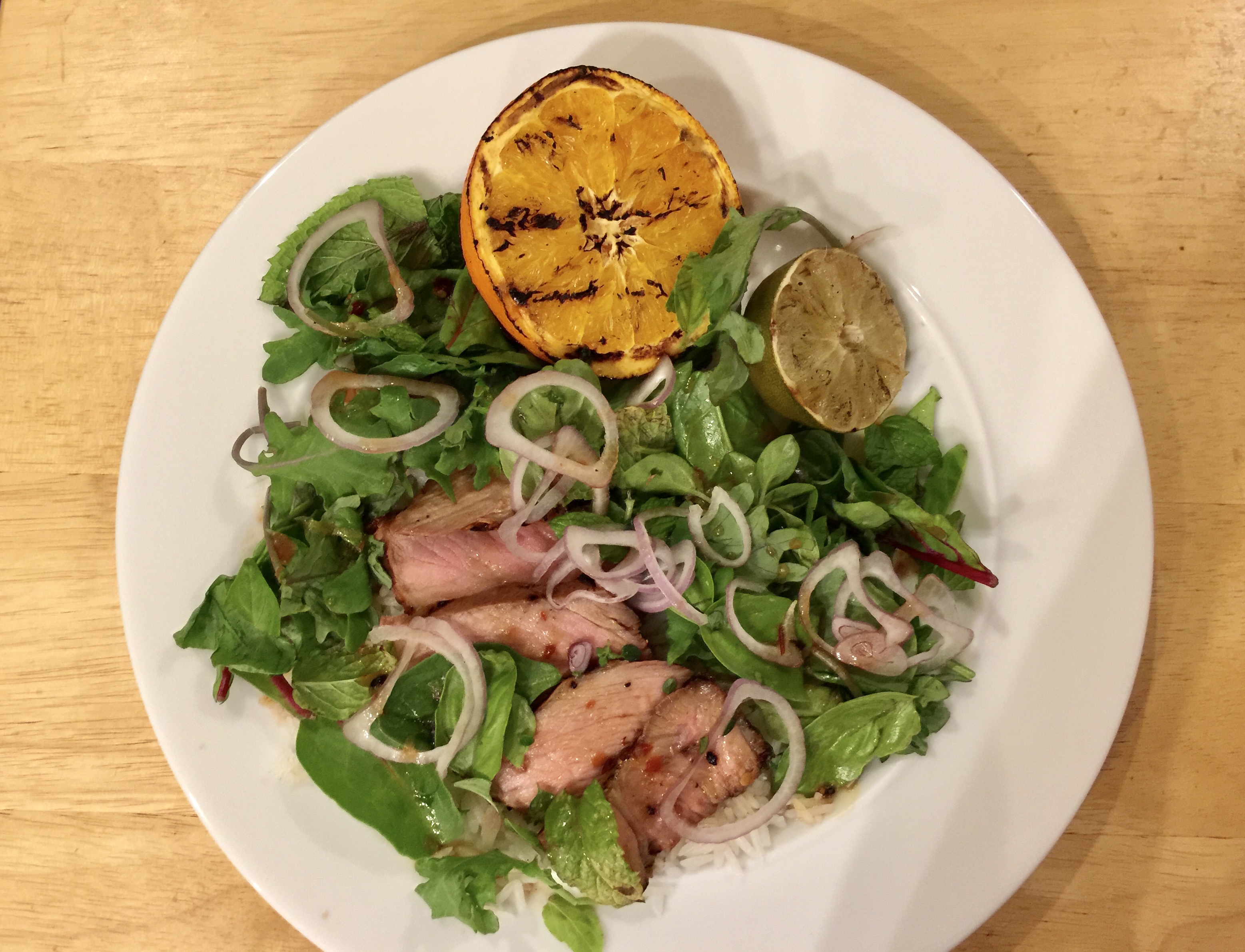 Sweet and salty grilled pork and citrus on a bed of rice, greens, and herbs