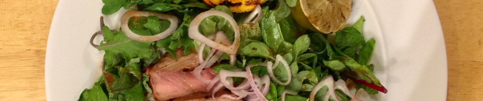 This is a new recipe for us adapted from one I saw on The NY Times Cooking site. We do not usually cook pork because most cuts of pork are dry and tasteless. For this dish, though, we can use boneless pork spare ribs which come from a much tastier part of the pig. All it takes is a quick marinade in a fish sauce/brown sugar/lime juice concoction before John cooks on the very hot grill for a very short amount of time. In the meantime I make some rice and clean the hearty greens and herbs. Put it all together and you are done!