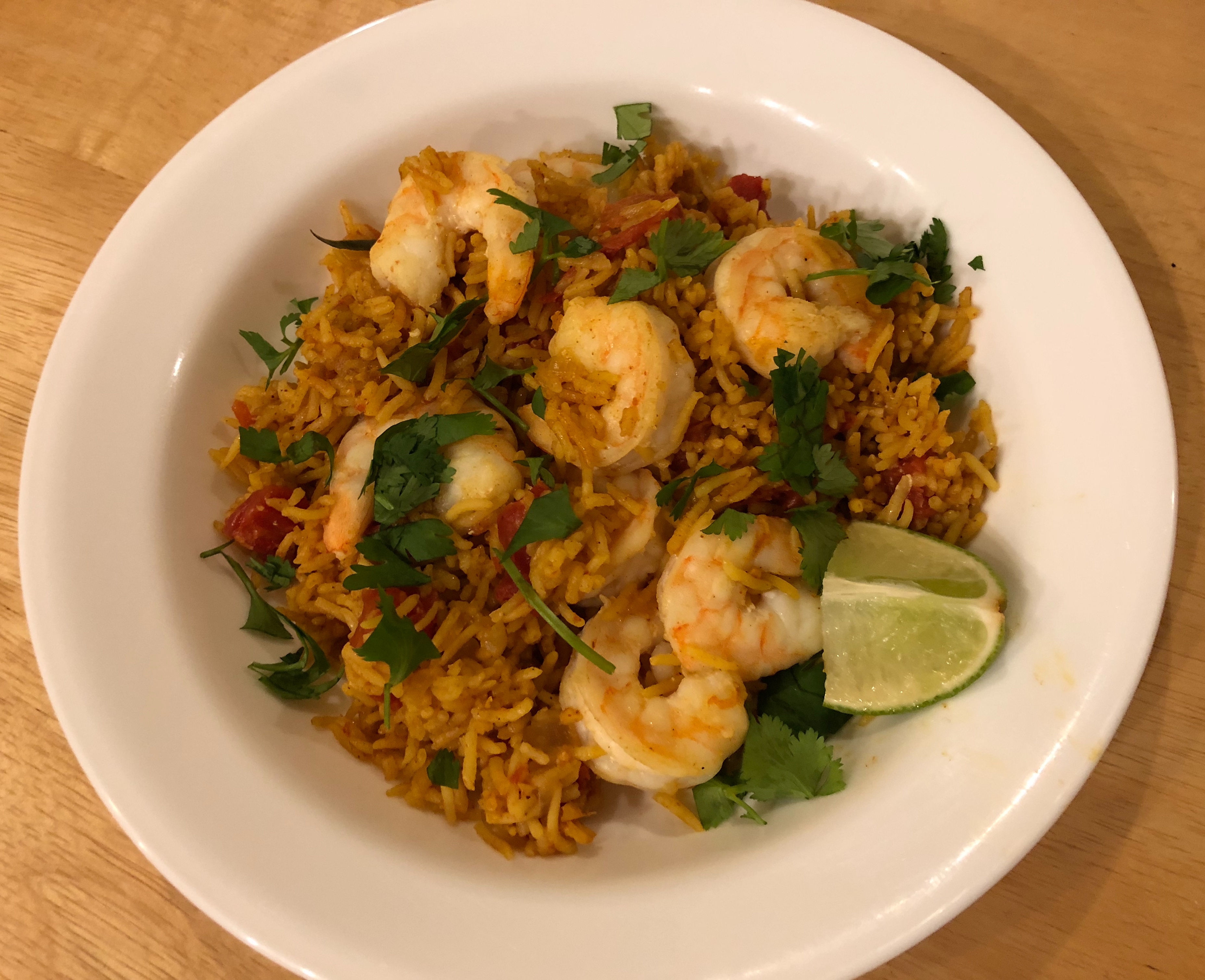 Originally this recipe for shrimp biryani was supposed to be made entirely in an Instant Pot. Since to use pressure cooking in cooking the shrimp needed jumbo shrimp and we only had smaller shrimp, we decide to cook the shrimp separately and just make the flavorful rice in the Instant Pot.