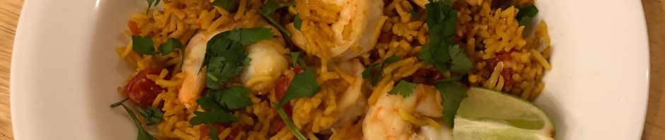 When we put it all together the dish is delicious! First we soak the basmati rice for 20 minutes and then drain. I cut up onion, garlic, ginger, and the curry leaves which I found at Ranch 99, a local Asian supermarket. John sautes the vegetables in the Instant Pot along with a bunch of spices. Then he adds the drained rice, tomatoes, and shrimp stock made from the shrimp tails. Cook on high for three minutes. Let steam off immediately and add the cooked shrimp and let the whole thing sit for a few minutes under a kitchen towel.