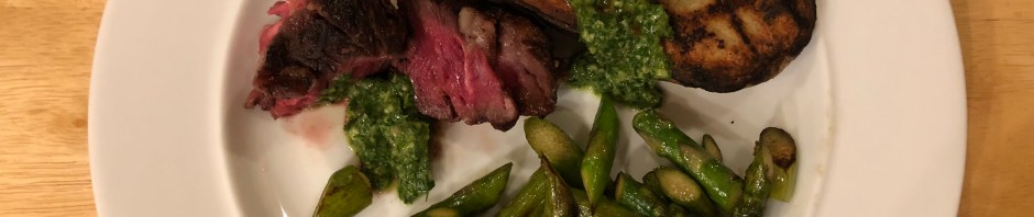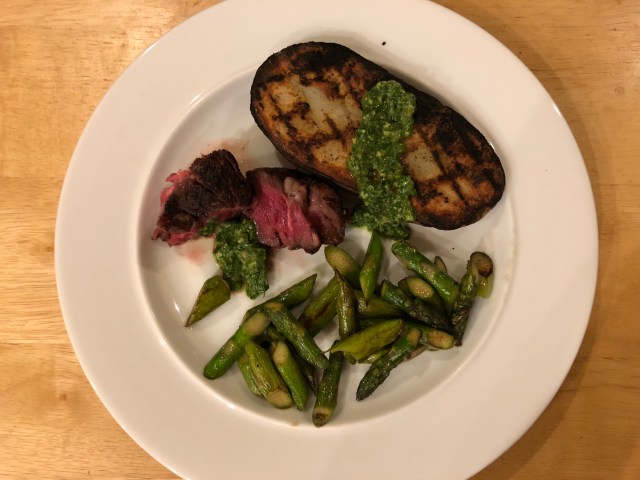Eat down is in full swing now. We have had this little steak piece moldering away in the freezer for quite a while so it is time to use it. One potato is enough for two people. And this is the third time I am using the asparagus I bought last week – one time with classic chicken, once as a pasta sauce, and tonight cut up so the six spears I have left look more substantial. I make a chimichurri sauce to use up a piece of shallot, leftover parsley, two garlic cloves, and half of an old lemon plus my everyday olive oil.