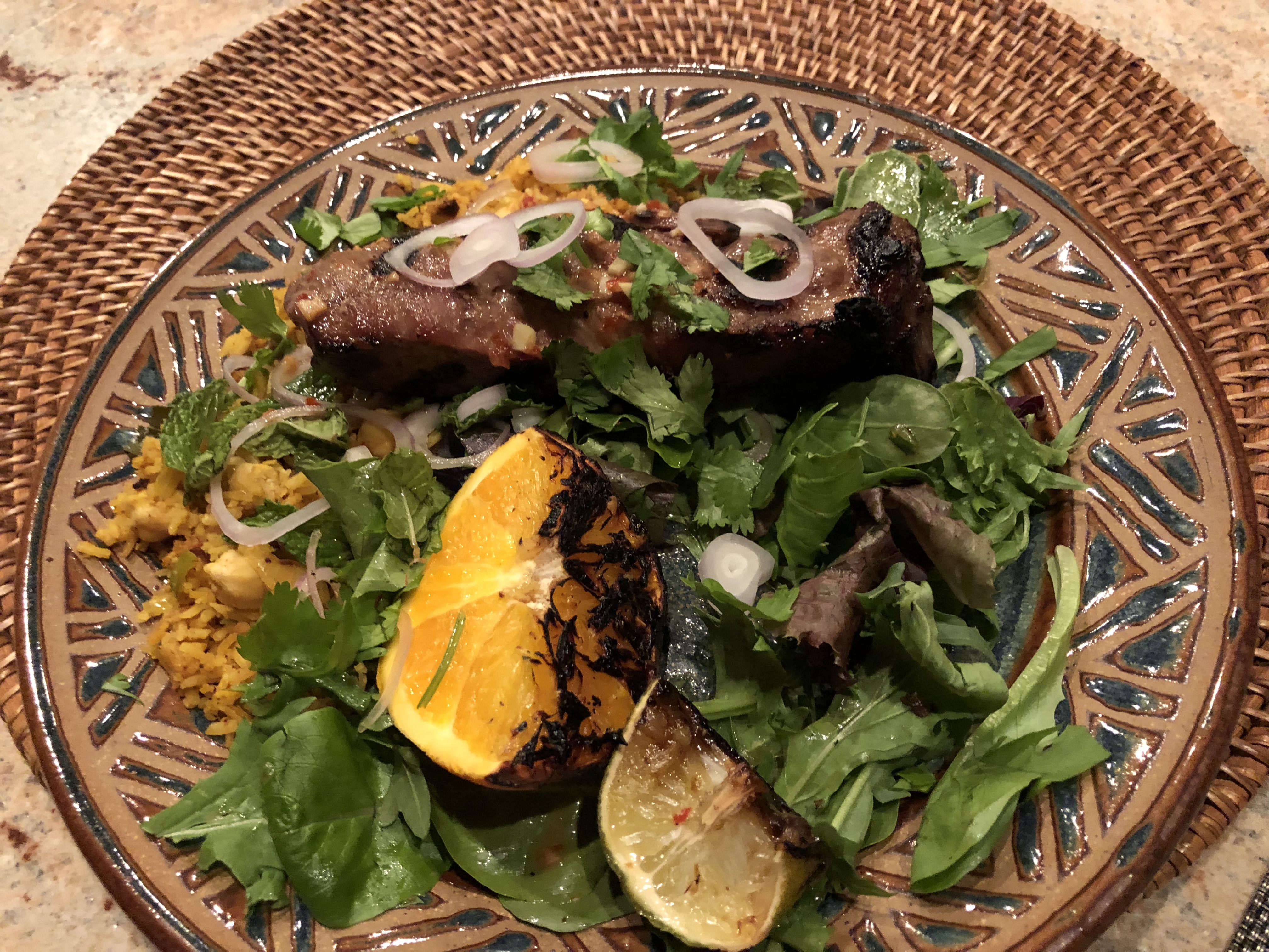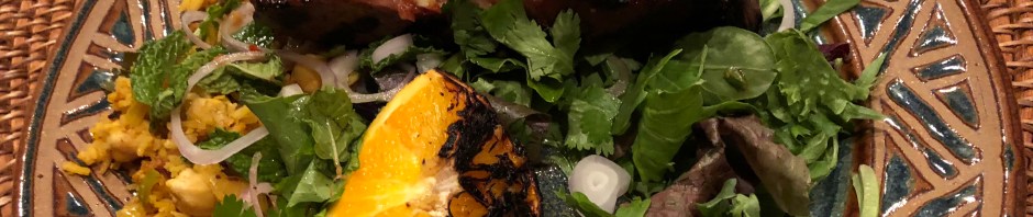 Anyway tonight’s dinner we have made once before cooking it only on the grill. It did not get cooked through so we decide to sous vide it first and then cook it on the grill. John marinates and sous vides the pork in a combo of brown sugar, fish sauce, lime, and garlic. Then he cooks it on the grill for about a minute a side. We serve it on a bunch of hearty greens with grilled orange and lime plus some leftover rice. It turns out delicious!!