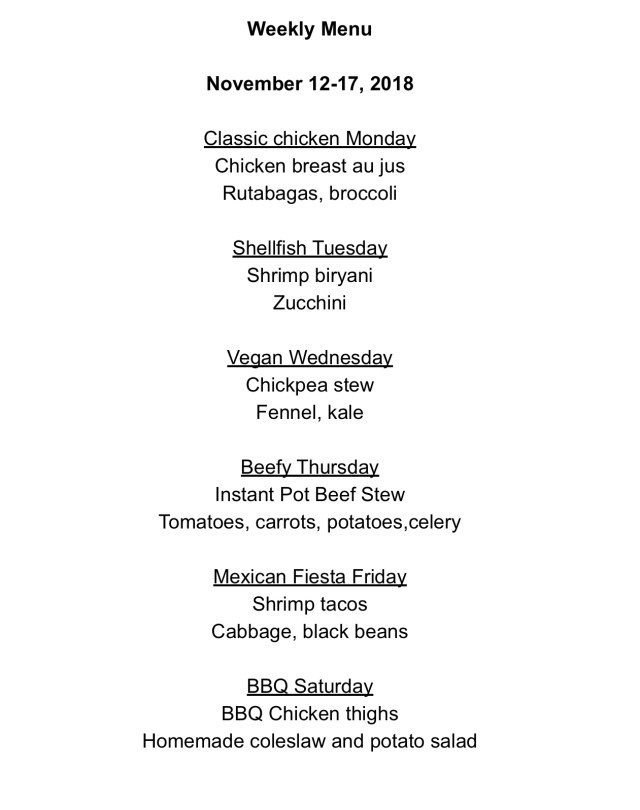 Since I have just been through a pretty intensive eating week, I am going with some tried and true selections for this week. My menu is being driven by what we have in the freezer since I need space for Thanksgiving. Also I am looking to see if I can use newly purchased ingredients in more than one way to use them up. For instance since I need some cilantro on Tuesday for the shrimp biryani, I am planning shrimp tacos on Friday to use up the rest of the cilantro. On Friday I need cabbage so I plan on coleslaw on Saturday to use it up.