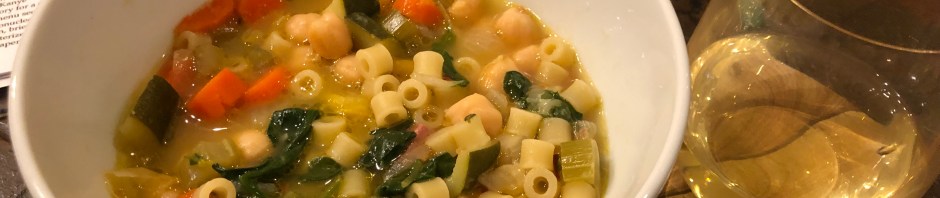 I finish up the chickpea stew that I made this morning with ditalini, a package of dark greens (no Romaine), and a little turkey sausage to make it hardier. It is actually fine without the meat but I am trying to use up extraneous bits in my refrigerator. It is pretty crowded at the moment what with all the Thanksgiving preparations. After ladling the stew into bowls, we finish the dish with parmesan cheese and some really good olive oil. I am so glad I made this in the morning because by the time it is dinner time I do not feel like making anything!