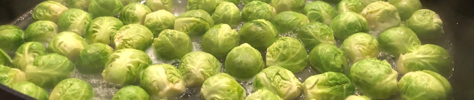 Next here are my Brussels sprouts cooking down in a little sugar, salt, butter, water, and dry sherry. Once the liquid is gone they will brown. The 120 B. Sprout halves took two big pans to lay out flat. This was cooked at the last minute.
