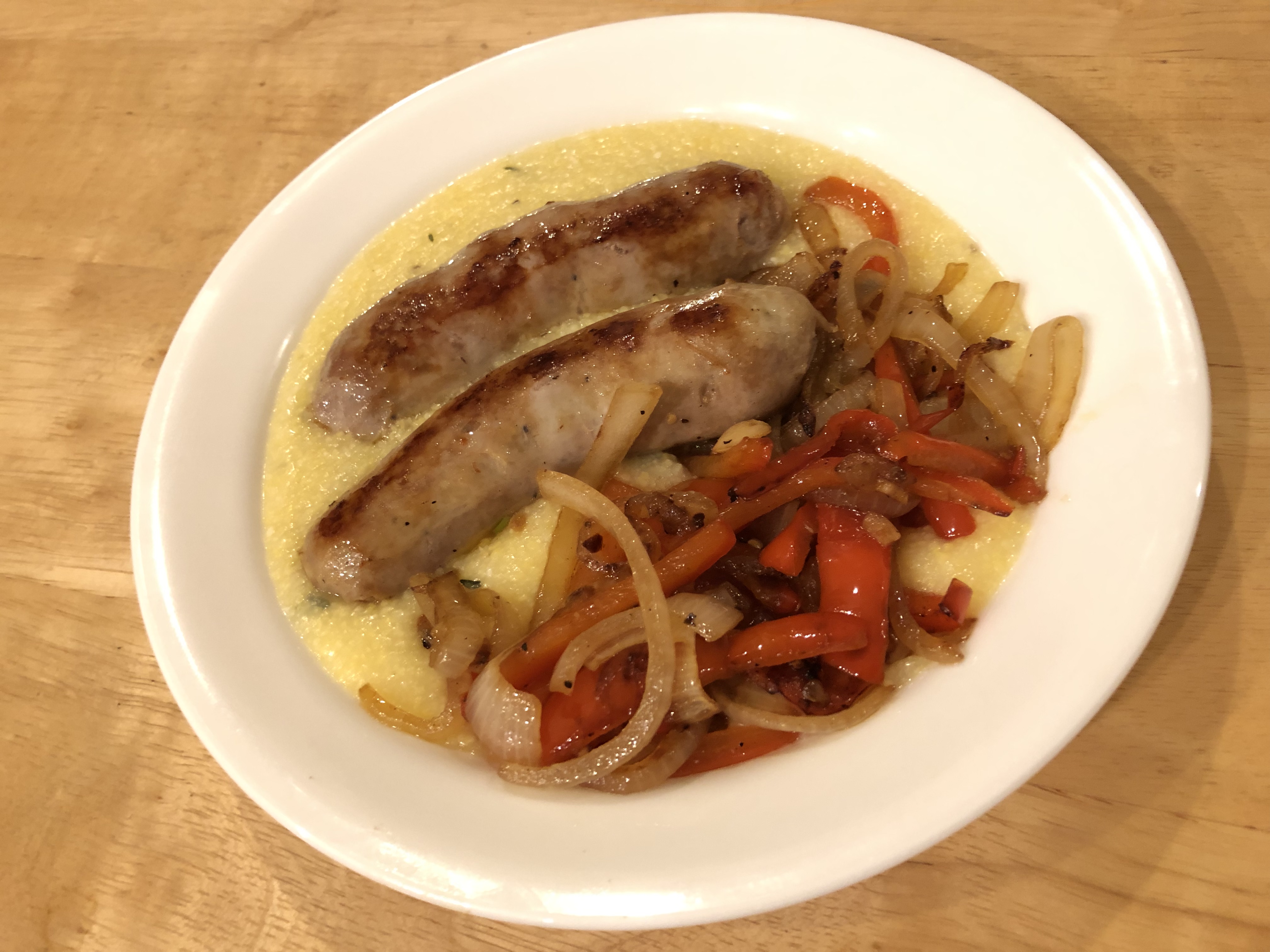 Here is a nice change if you are tired of the turkey routine, sweet Italian sausage with plenty of sautéed onions, bell pepper, and garlic over a bed of creamy polenta. In order to make things go faster, John starts the sausages in a pan with some olive oil and about a quarter inch of water, while I cut up and sauté the veg in another. The sausages steam while the water evaporates and then they brown. This keeps you from getting too hard a crust on them. We combine the veg and the sausages in my pan at the end of cooking.