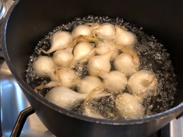To begin the prep work I need to peel the pearl onions. I do this by briefly putting them in boiling water. It is supposed to make it easier to get the peel off. John comments that there must be a magic way to get the peel off more easily. Sorry, John, this IS the magic way.