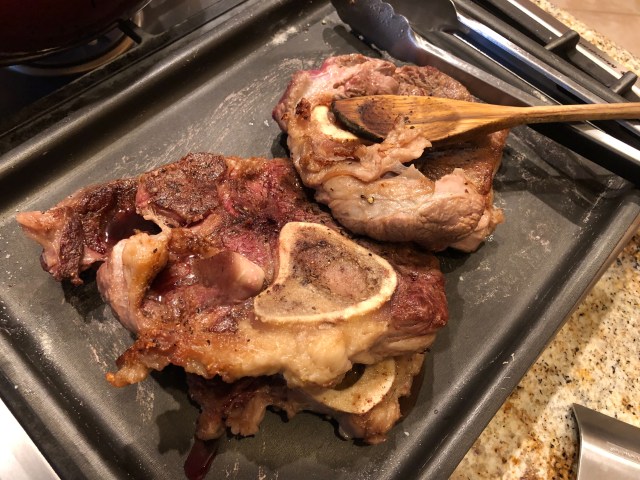 Then while I am peeling the onions and chopping up carrots, mushrooms, potatoes, garlic, and thyme, John browns the meat. We wanted to use boneless short ribs but our grocery store did not have them so we went with beef shank. It is a very unattractive cut of meat.