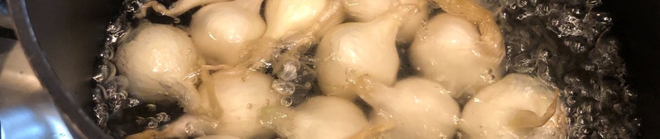 To begin the prep work I need to peel the pearl onions. I do this by briefly putting them in boiling water. It is supposed to make it easier to get the peel off. John comments that there must be a magic way to get the peel off more easily. Sorry, John, this IS the magic way.