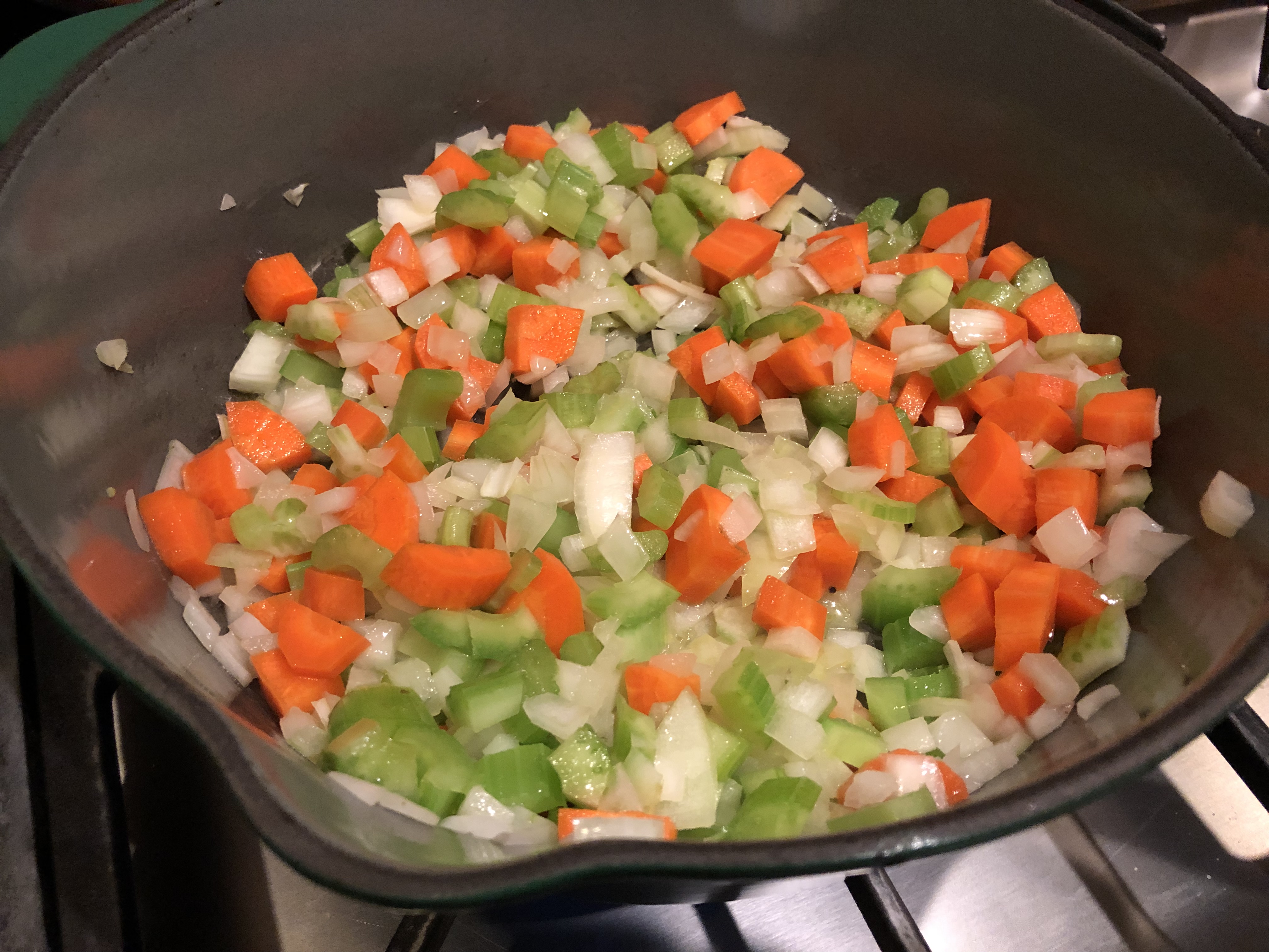 Chop up 2 carrots, 2 celery ribs, and a medium onion. Put them in pot with a glug of EVOO over medium/low heat while you assembly the rest of your ingredients. Be sure to season your veg with salt and pepper.
