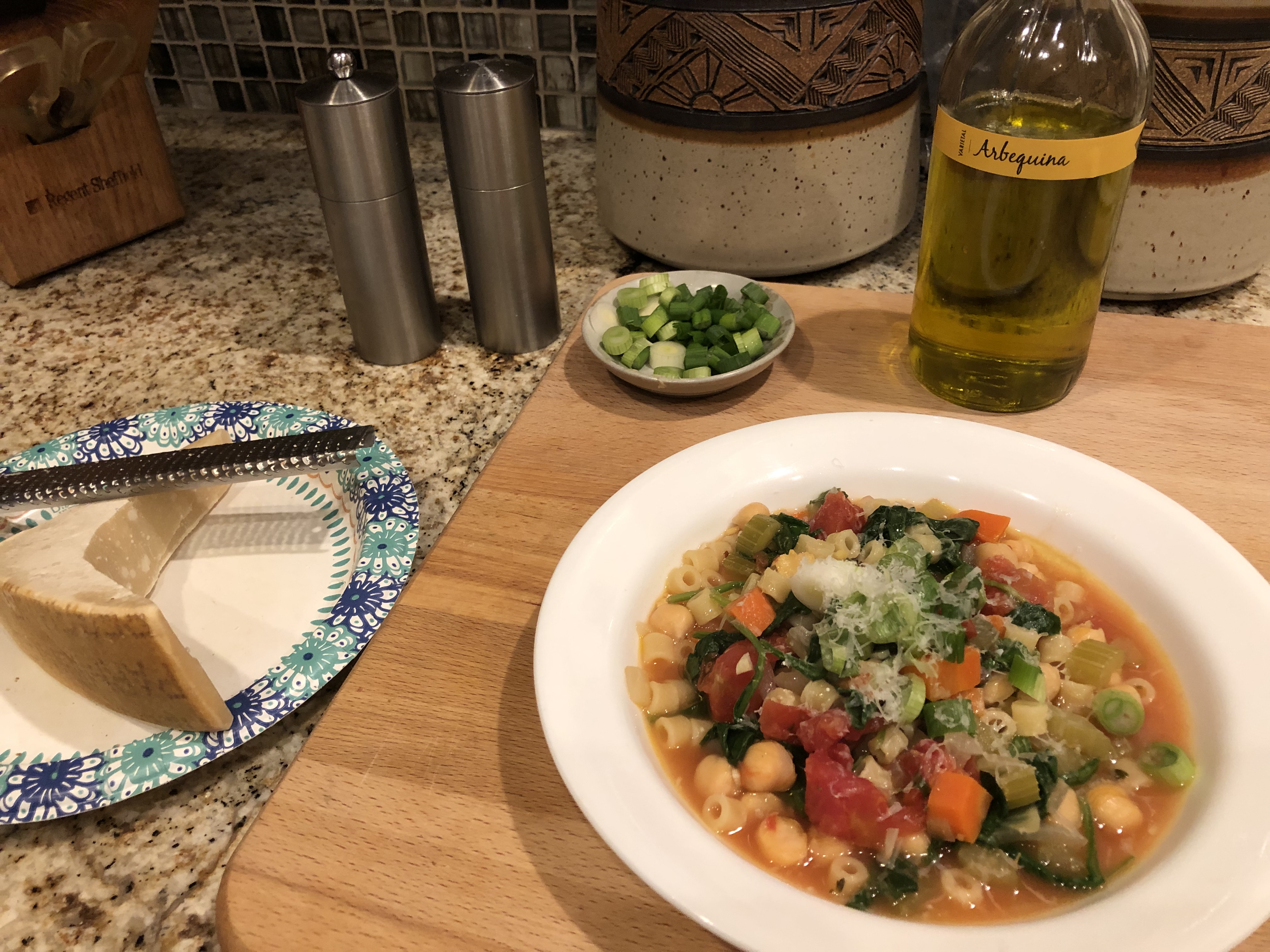 We top our completed dish with chopped scallions, grated Parmesan (omit in vegan preparation), and a good finishing olive oil. In about half an hour you have a warm comforting dinner that is delicious and good for you. Plus you will have plenty of leftovers for lunch the next day.