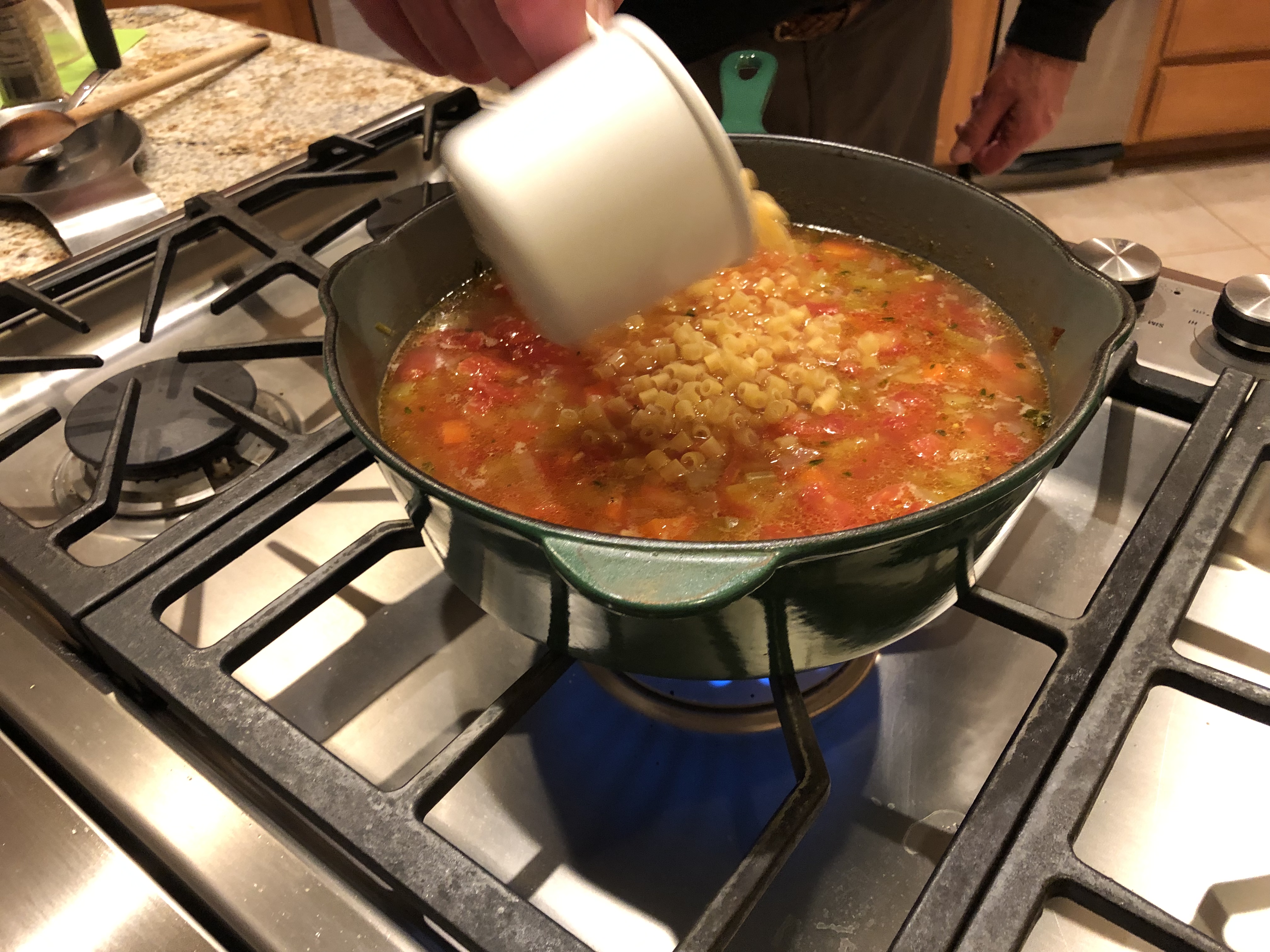 When boiling add 4 oz. of ditalini. Cook according to package directions. You may need to add a bit more water during this step if it looks too thick due to the ditalini swelling up.