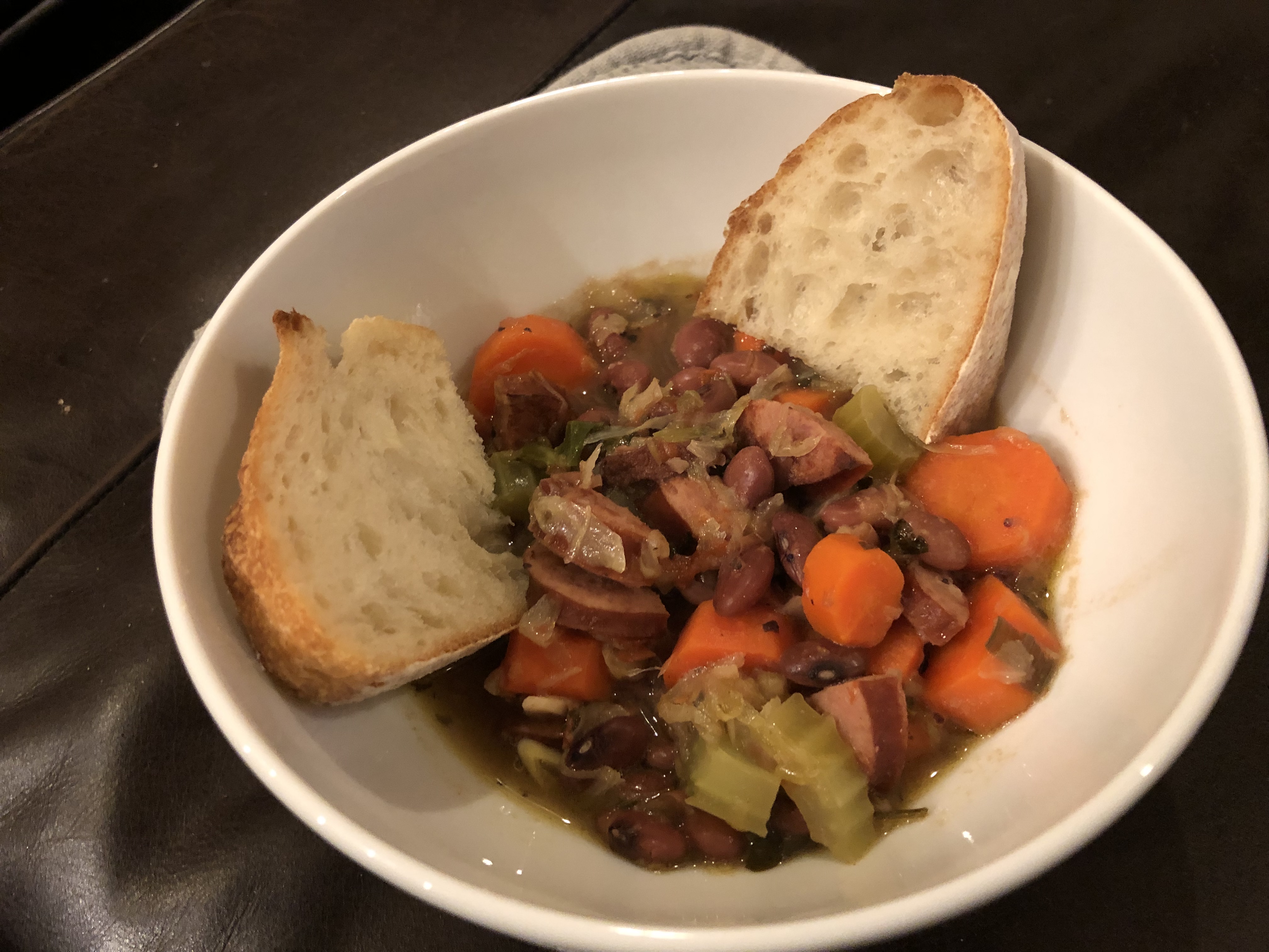We still have some of the red beans from January 1st left in the refrigerator. Today I take the rest of the beans, the smoked sausage that I forgot to put in the red beans and rice I made, and onions, carrots, celery, and beef stock to make somewhere between and soup and a stew. It is fast and easy. My only problem now is that I have left over sausage and bean soup!!!