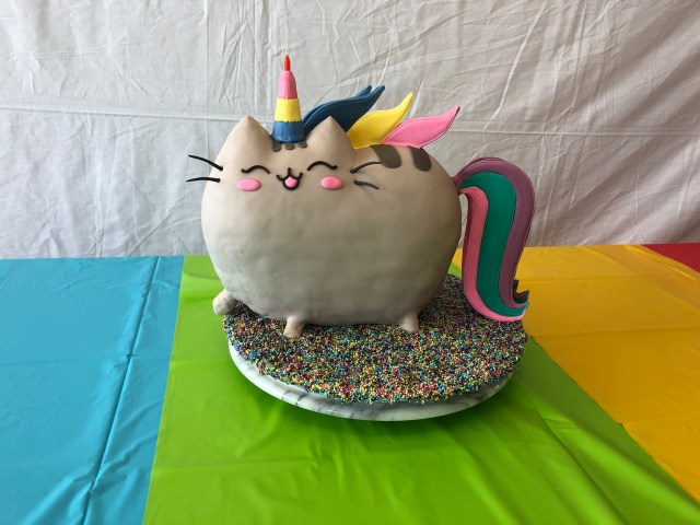 Our daughter-in-law’s sister is an expert cake maker/decorator. She has appeared and won a competition on Food Network. For her nephew’s (our grandson’s) birthday she always makes amazing cakes. This year’s cake was the cartoon character, Pusheen. Pusheen appears in GIFs and as stuffed animals. This is her amazing cake.