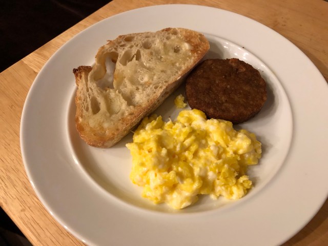 I love eggs and snausage for breakfast, lunch, or dinner! Just to be clear, I am not recommending dog treats for dinner. Snausage is the name John and I use to identify vegetarian sausage from carnivore sausage. We use Morningstar Original sausage patties. One takes about one minute in the microwave.