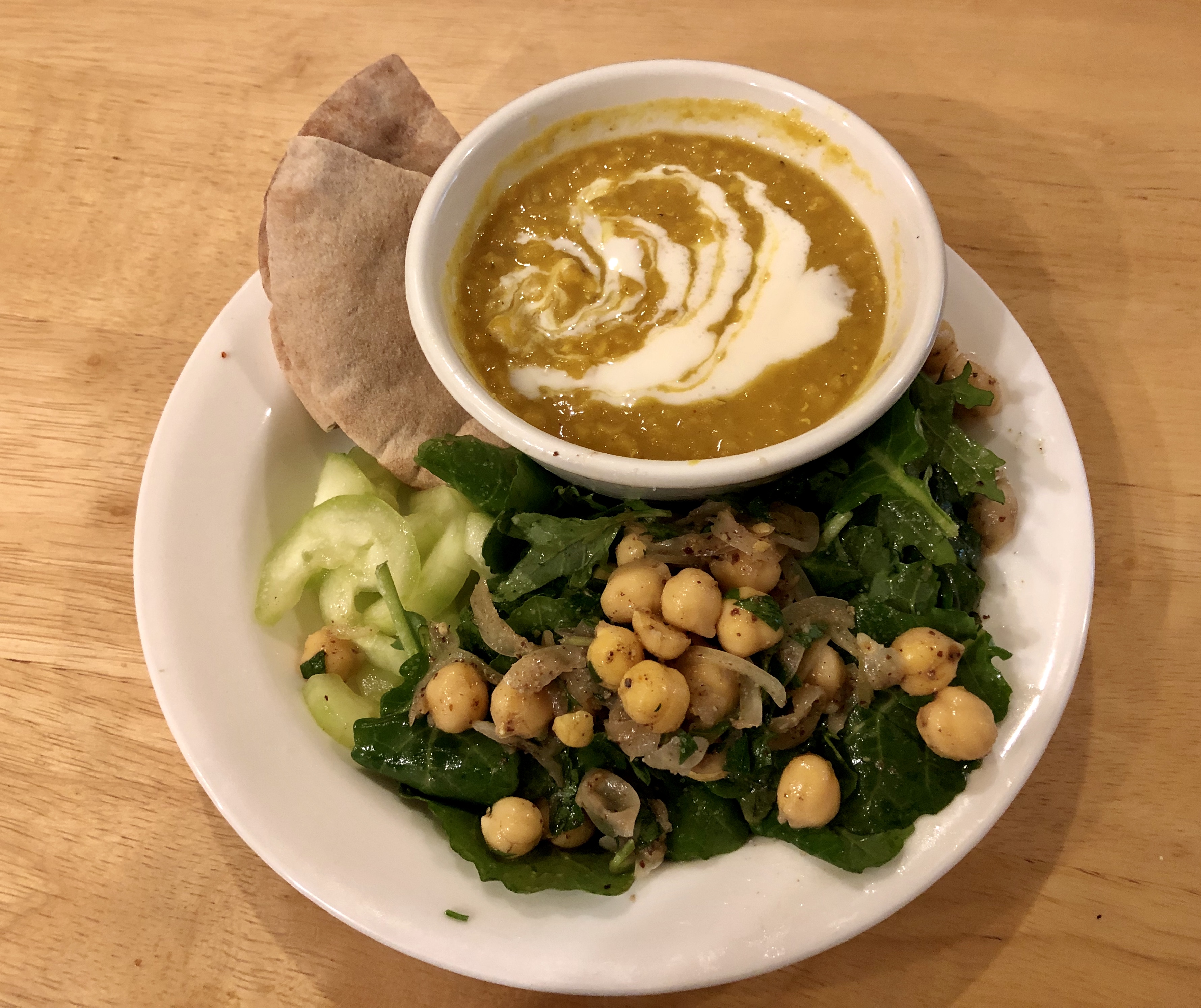 Every time I make this I think, “This is so good and easy to make. I should put it on the menu more often!” Basically this a chopped up medium onion, 2 cloves of minced garlic, and 1/2 T. of minced ginger sautéed in some oil or butter. Add 1 cup of picked over and rinsed red lentils and 2 1/2 cups of stock. Bring to a boil and simmer until the lentils are softened, about 15 minutes. Ta da, you are done except for making sure the seasoning is right. It is quite soupy and very delicious. You can put a swirl of yogurt on it or not.