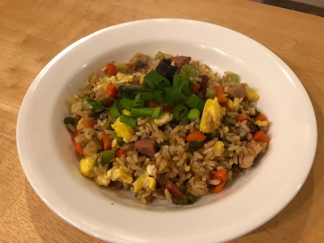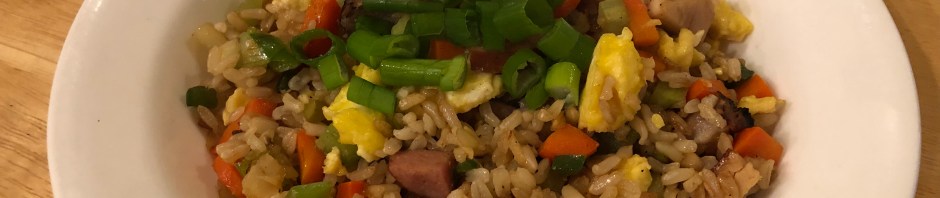 The vegetables I chop up are the whites of green onions, carrot, celery, and seeded jalapeñ0. Then I add the leftover meats to heat through. (Today I have a little pork, a chicken thigh, and a little smoked beef sausage.) Set aside. Scramble 2 eggs fluffy. Set aside. Add some butter to the pan and put in the rice and cook it until it is crispy on the bottom. Add back in all the vegetables, meat, and egg. Cook together briefly adding soy sauce and sesame oil to taste. Garnish with the tops of the green onions.
