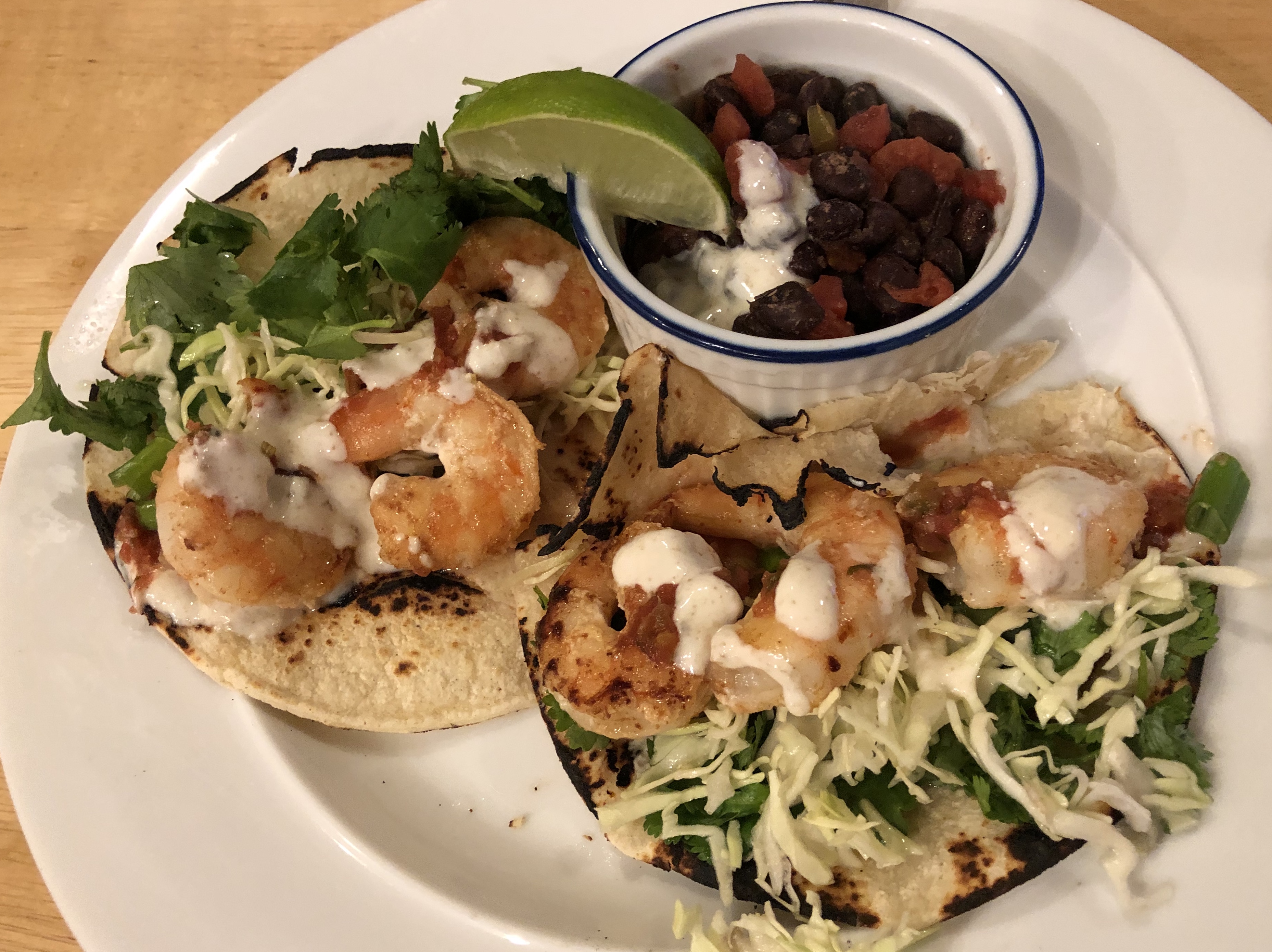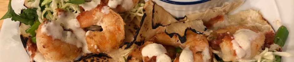 What a good way to kick off February with shrimp tacos and black beans! This dinner is easy to make and healthy to eat. John sautés some shrimp and toasts tortillas over an open flame while I get together the condiments and warm the rinsed, canned black beans mixed with a half can of Rotel, some chipotle powder, and ground cumin. Our taco assemblage includes the shrimp, cilantro, green onions, fresh salsa, shredded cabbage, and a crema made of plain yogurt, salt, and cumin. Use the grocery store to make this simpler-canned beans, packaged shredded cabbage, and store bought fresh salsa make dinner easy!