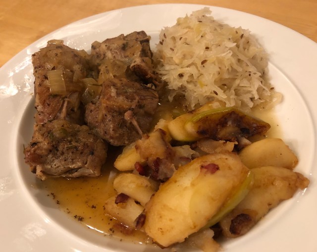 The boneless pork ribs are simply seasoned, seared and go in the Instant Pot with a bunch of onions (also browned first.) Twenty minutes under high pressure and a natural cool down leaves the pork cooked through and very tender. I warm up some sauerkraut seasoned with caraway seeds. I cook a piece of chopped up bacon and put it aside while I brown some onions in the bacon fat. Finally the apples go in with a little butter and I cook them until they start to brown and garnish my apple concoction with the bacon bits.