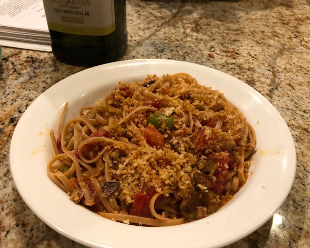 I had to revamp my weekly menu plan due to bad weather which kept us away from the grocery store yesterday. Luckily I always have the ingredients in my pantry for my Italian vegan dinner, whole wheat linguine in a sauce of tomatoes, garlic, onions, and capers garnished with toasted breadcrumbs.