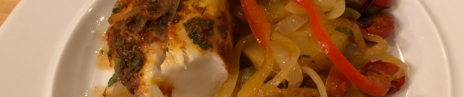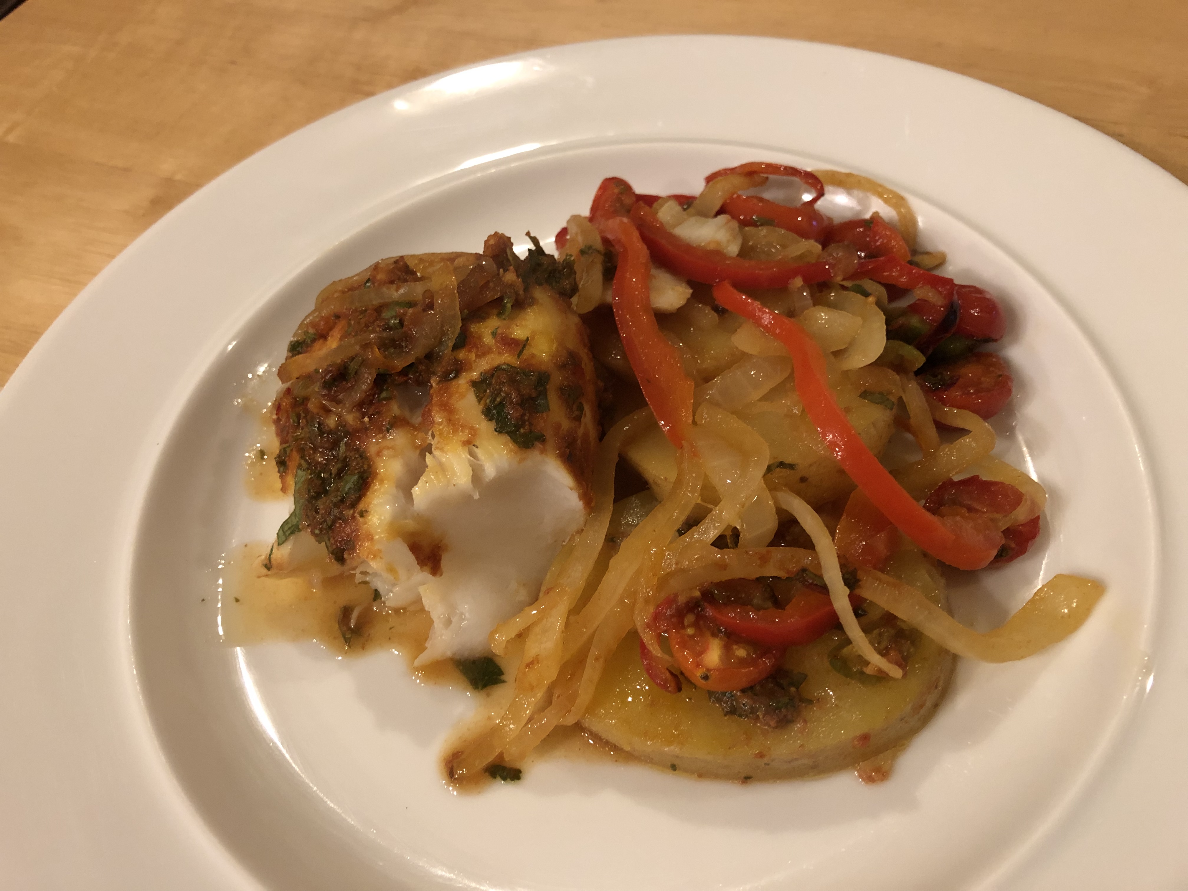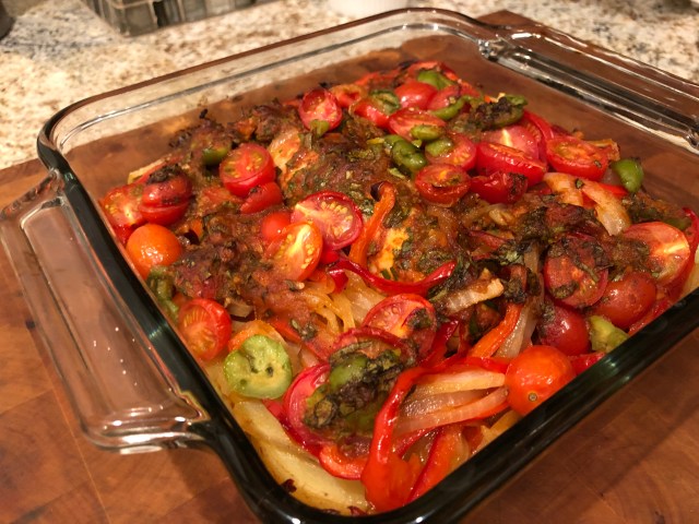 I precook some slabs of Yukon Gold potatoes. They make the base that the fish will bake on. Over the top of the fish are sautéed onions and peppers, cherry tomatoes, olives, and the marinade. Here is how it looked coming out of the oven.