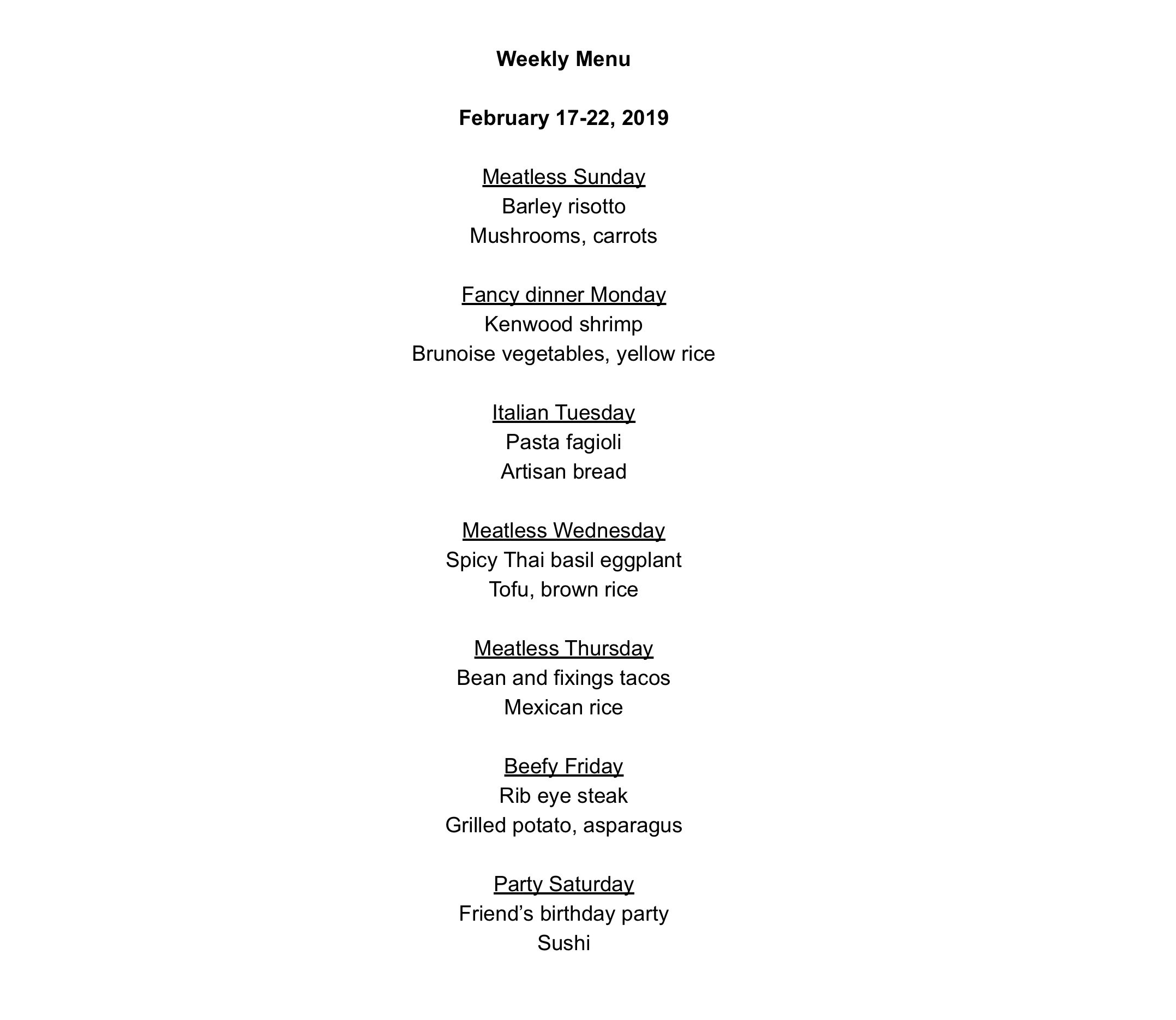 I’ve also upped the number of vegetarian or close to vegetarian meals this week. Usually we have one or two but this week there are three full-fledged vegan or vegetarian meals and one, pasta fagioli, that just has a little meat seasoning. I am happy about this.