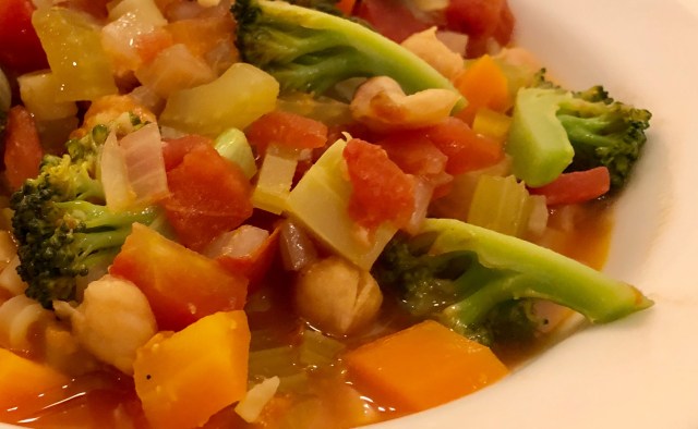 If you are looking to use up vegetables that have sat a little too long in the crisper this vegetable stew is a great way to turn them into dinner. Carrots, onions, fennel, celery, garlic, tomatoes, and broccoli (or what ever you have) get cut to a similar size and cook in 4 cups of vegetable stock or, as I do, jut plain water with a parmesan rind for extra flavor. Once the vegetables are par-cooked add the chickpeas, bring the pot up to a boil, and add the ditalini. When the pasta is cooked (about 10 minutes) your vegetable stew is ready to serve. I finish mine with a sprig of thyme and a drizzle of good olive oil.