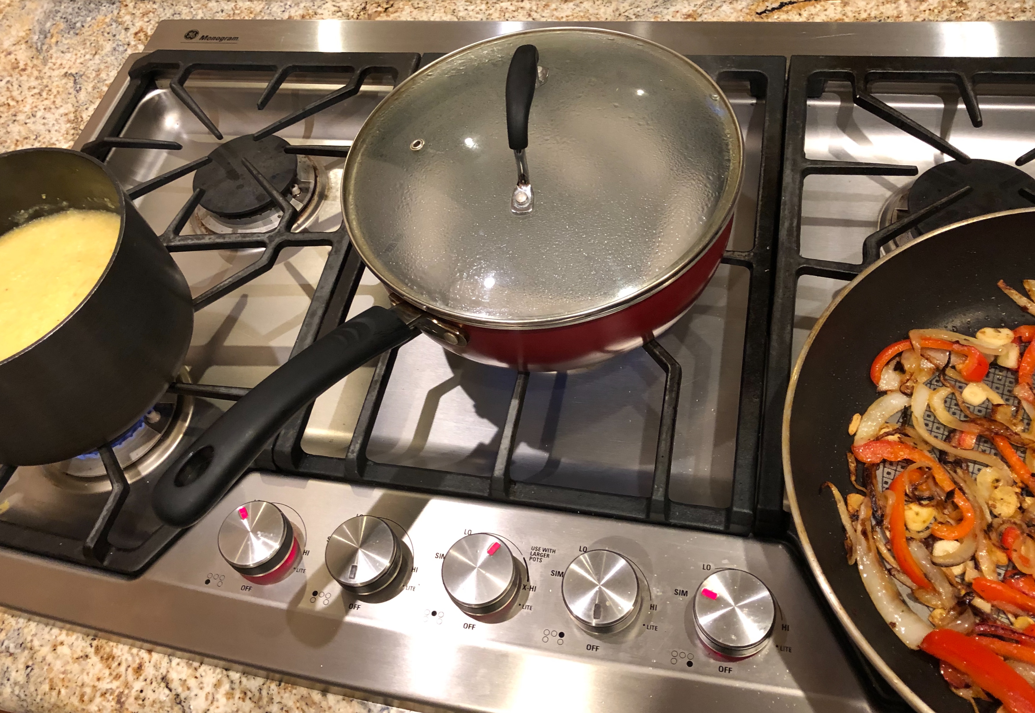 Today is not all about baking (see my other post, Nana Banana Cake) we also need to eat dinner! While John is taking lead on the dinner making the sausage and polenta, I have a supporting role in the onions, peppers, and garlic.