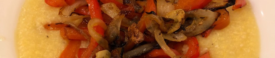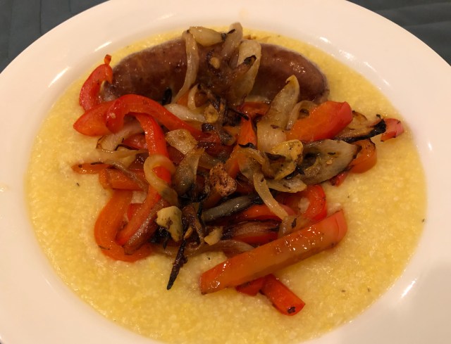 John makes his polenta with a 5:1 water to polenta ratio and starts the sausages in some water and later browns them off. The polenta is deliciously loose and the sausage are well-cooked but not dry. The topping of onions, peppers, and garlic is yummy.