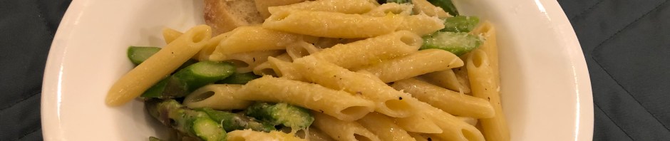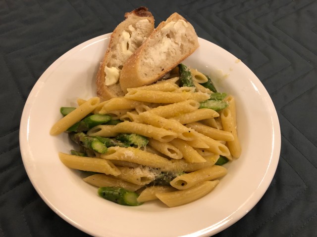 I cut the asparagus into the same shape as the penne and really only cook it while adding the penne, pasta water, pepper, and parmesan together to make a sauce. It turns out kind of like cacio e pepe except with penne instead of strands and asparagus.