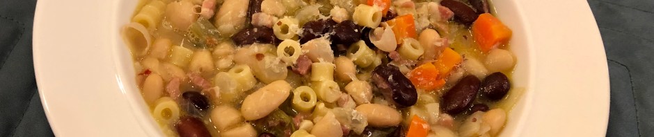 John is working at his office today so I am flying solo tonight for dinner. This pasta fagioli is based on a recipe by Giada De Laurentiis of Food Network fame. You can take a look at her recipe here. The changes I make are to add carrots and celery, use cannellini and kidney beans, sub out the chicken stock for half veg stock and half water, add Parmesan rinds to the stock, and sub in ditalini for macaroni. Although it is easy to make this soup vegetarian by leaving out the pancetta, the pancetta does give it an incredible depth of flavor. But if you do use the pancetta, do not use additional salt!