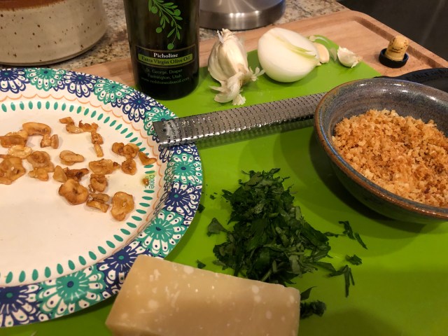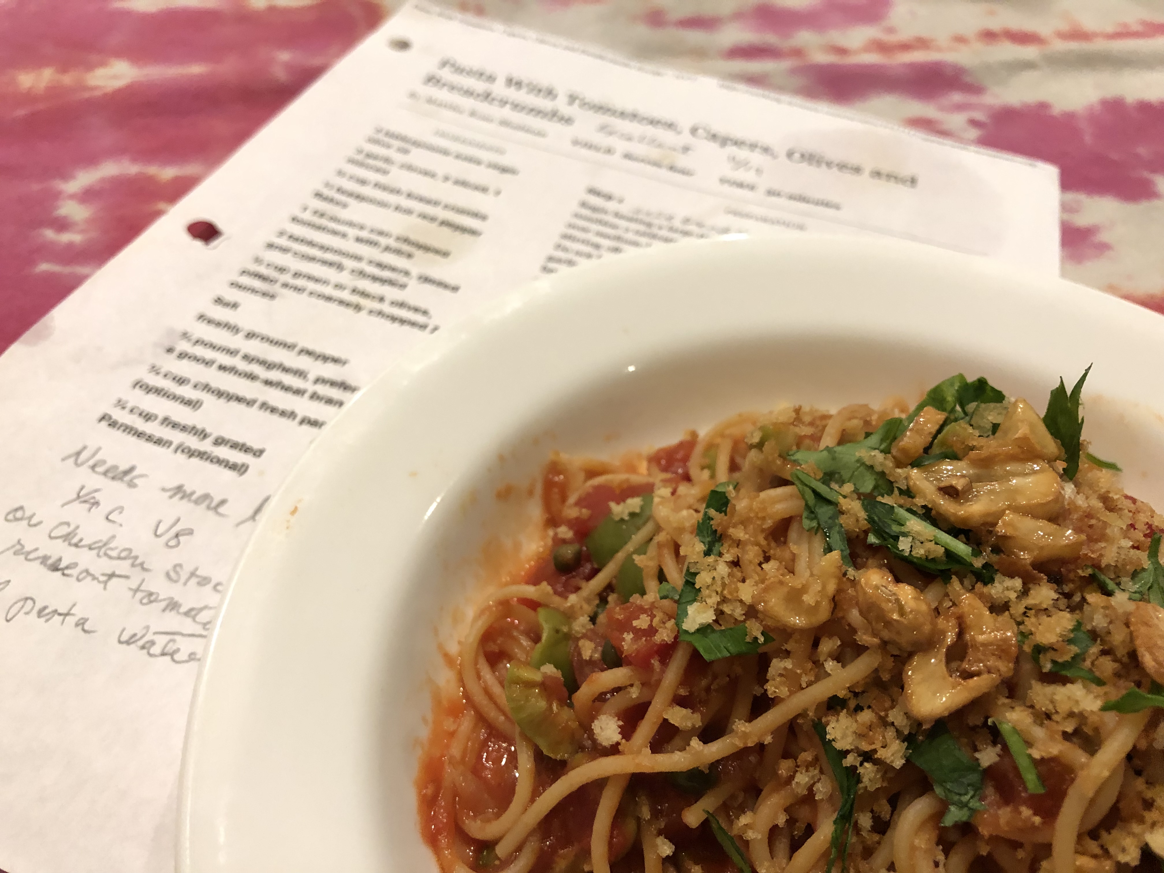 After toasting some garlic slices and breadcrumbs along with chopping up some parsley I set those aside for the finished dish. In the time that it takes John to bring the water to a boil and cook the pasta, I make the sauce. It is just a quick sauté of garlic, onions, and pepper flakes, then add the tomatoes, olives, and capers. Don’t add salt to the sauce! The capers and olives take care of the needed salt. I adjust the flavor with a pinch of sugar. Be sure to save a cup of pasta water to thin out the sauce before you toss the drained spaghetti into the sauce.
