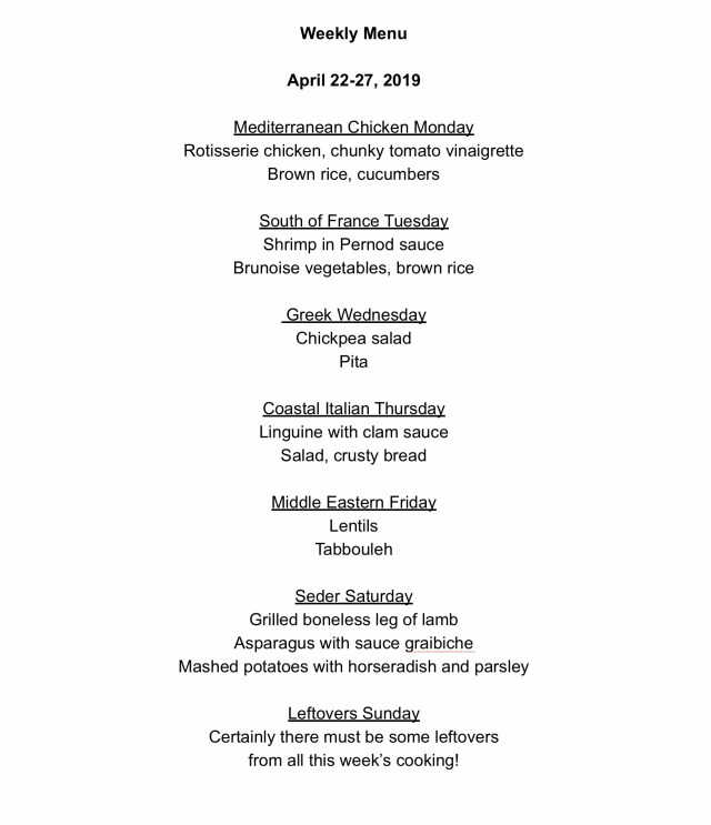 This week I am trying a more a Mediterranean take on our dinners. In Spain we learned that the local people tend to eat vegetables, whole grains, fish and shellfish, and the occasional chicken or rabbit. Red meats are mostly infrequent, saved for special occasions. So this week my menu has one chicken, two seafood, two vegan, and one special occasion lamb meal.