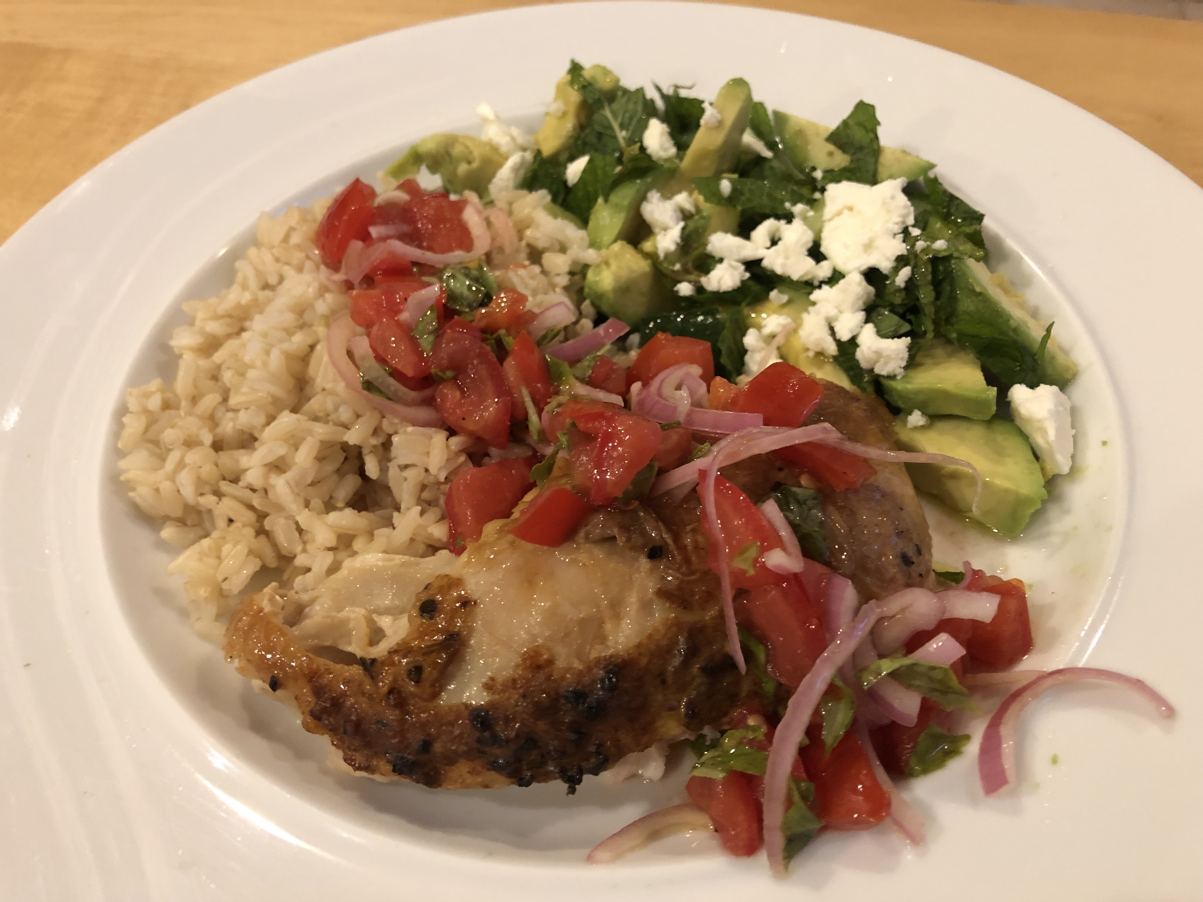 Chicken and brown rice served with a chunky tomato vinaigrette and cucumber-avocado salad.