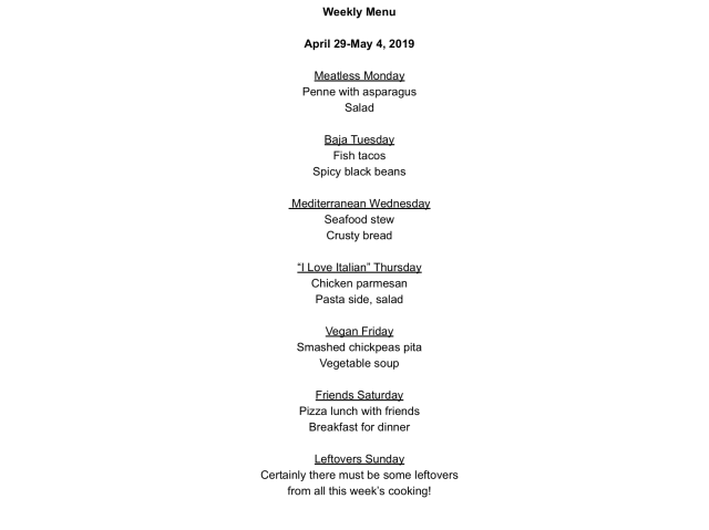 We did a lot of cooking this past week. Nonetheless I did punk out on Wednesday and ordered pizza instead of making linguine with clam sauce. Oh well, I am not perfect and linguine with clam sauce is a pantry type meal and will keep for a future dinner. Our big dinner on Saturday, soup, boneless leg of lamb, mashed potatoes, and asparagus with two different sauces took a lot of effort so I am going a little easier on us this week. Three vegan or vegetarian meals, two fish/seafood meals, and chicken will make this a pretty healthy week.