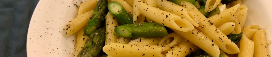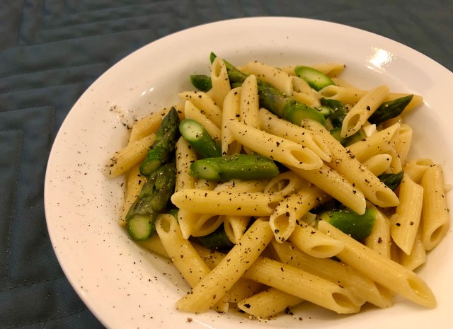 I cut the asparagus to mimic the shape of the penne and while the penne was cooking I sautéed a little onion and garlic in some olive oil. Then I added all the asparagus pieces except for the tips with a touch of the boiling water and covered it for a minute or two. Reserving a cup of pasta water, John dumped the al dente penne into my pan of asparagus and I added the asparagus tips. The whole thing cooked together for two minutes with maybe a half cup of the pasta water to make a sauce. A little finishing oil and some freshly cracked pepper were my garnishes.