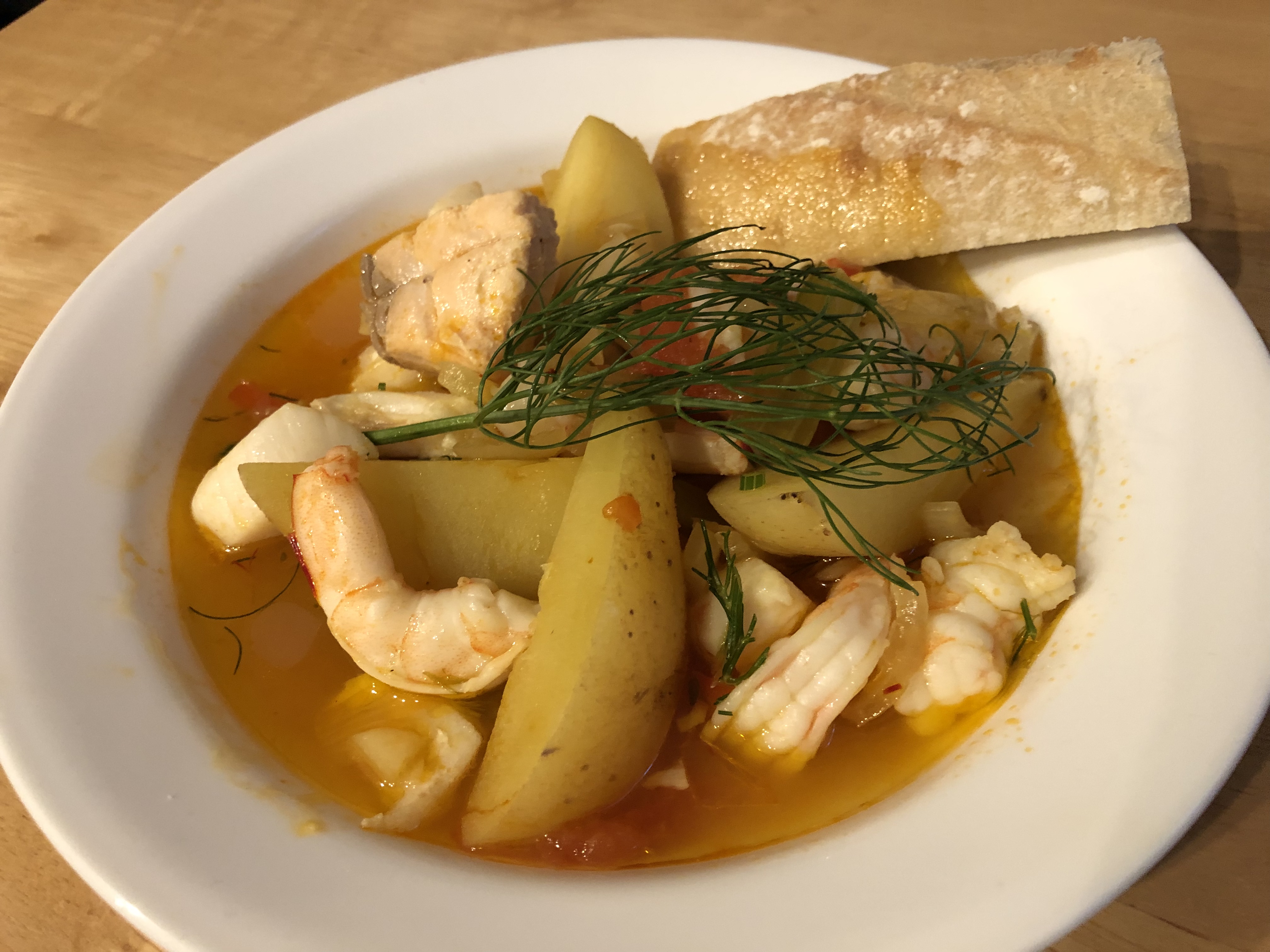 Our Mediterranean fish soup was served with a drizzle of olive oil, a fennel frond, and some crusty bread