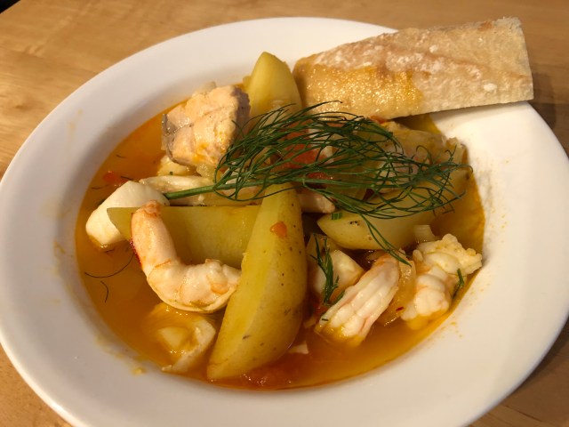 Mediterranean fish soup is a delicious combination of fish and shellfish, vegetables, and a slightly fennel-tomato-Pernod fish stock. It does not take long to cook but there is a lot of prep work. You can find the recipe by Rick Stein, famous British chef, on the internet here.