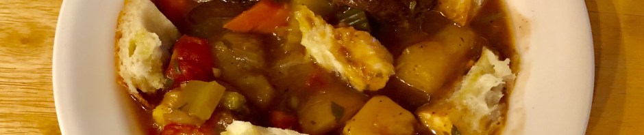 All the basic ingredient are the same – seared boneless beef short ribs, sautéed onions and garlic, aromatic vegetables like carrots and onions, waxy potatoes, beef stock, tomatoes, herbs, and spices. Cook it on high pressure for 20 minutes and then let it cool down partially for another 10 minutes. Then open the pressure gauge to release the rest of the steam and add a slurry to thicken the broth. I served my bowl with a garnish of Italian olive oil and some Pugliese croutons.