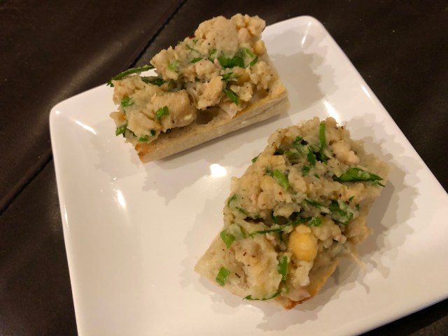 We started our dinner with chickpea crostini. This is a combination of mashed chickpeas, olive oil, green onions, parsley, lemon juice, salt, pepper and sumac spread on a toasted Italian crouton. Yum, so good!