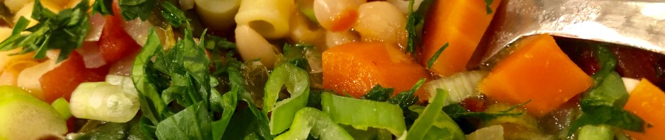 In my stew the vegetables are onions, garlic, carrots, canned petite-diced tomatoes, celery, and pimentos. The pasta is ditalini and I used a Spring Mix pre-packaged salad mix. While my canapés are vegan, my stew is vegetarian since I used the Parmesan rinds which give the broth a great depth of flavor. We will have plenty of leftover stew for lunches.