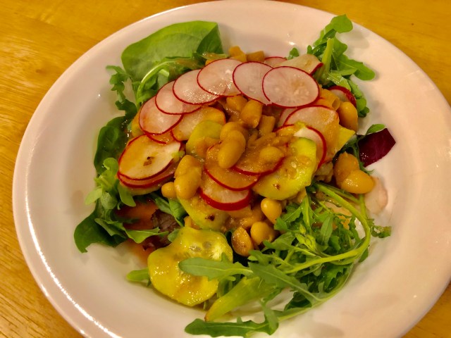 It is pretty good although our lightly salted butter combined with the miso made the dish quite salty. I also think using olive oil or a neutral oil would work in place of the butter and also keep these beans in the vegan realm. John enjoyed the cooked radishes but I would prefer to keep the salad greens, radishes, and cucumbers (my addition) raw and just let the warm miso beans wilt everything slightly.